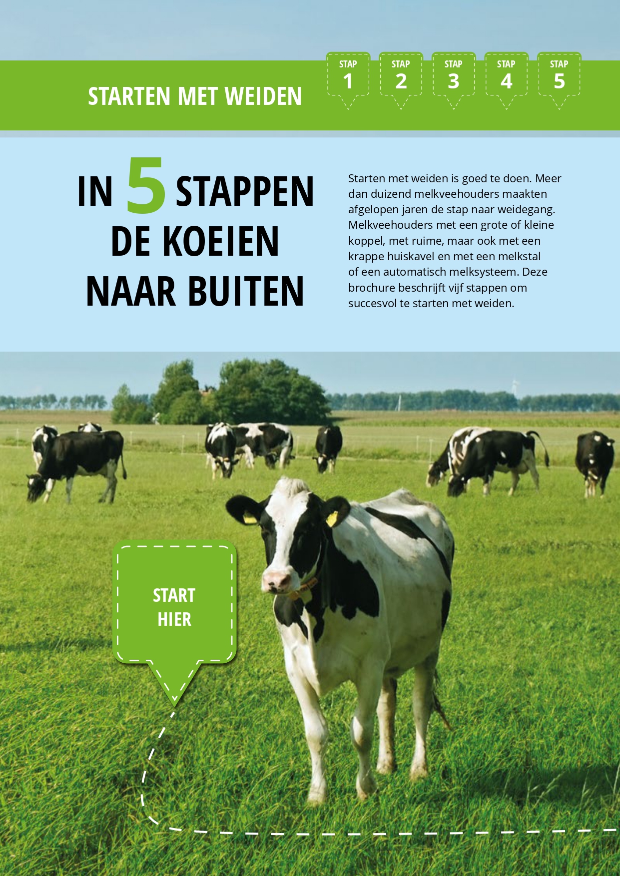 Starten met weiden is goed te doen. Meer dan duizend melkveehouders maakten afgelopen jaren de stap naar weidegang. Melkveehouders met een grote of kleine koppel, met ruime, maar ook met een krappe huiskavel en met een melkstal of een automatisch melksysteem. Deze brochure beschrijft vijf stappen om succesvol te starten met weiden.